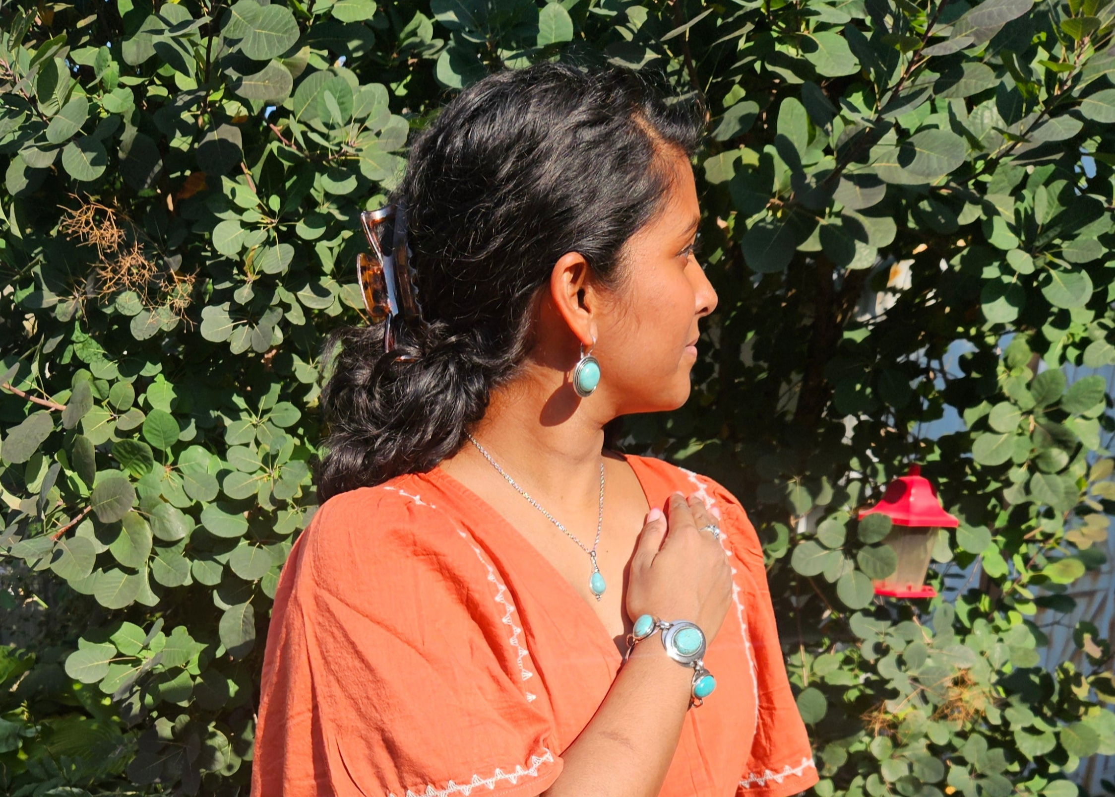 Our turquoise inspired earrings, bracelets, and necklaces are designed to be as versatile as your style. Whether you want to make a bold statement or keep your look effortlessly minimal, these pieces adapt beautifully. Layer them for a striking, vibrant finish, or wear them solo for a subtle pop of color that still speaks volumes. However you style them, turquoise adds timeless charm and modern edge to any outfit.